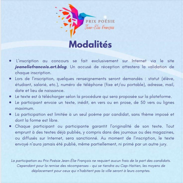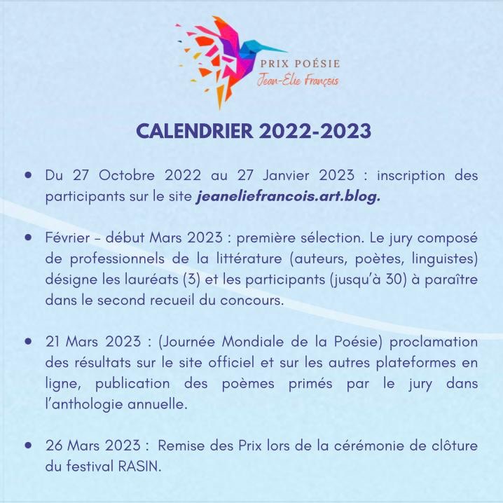 Ce concours qui s’étend sur tout le territoire national s’adresse aux jeunes de 13 à 26 ans ayant le goût des lettres. Les textes seront reçus jusqu’au 27 Janvier 2023, en français ou en créole haïtien, sur le site officiel du Prix: https://jeaneliefrancois.art.blog.