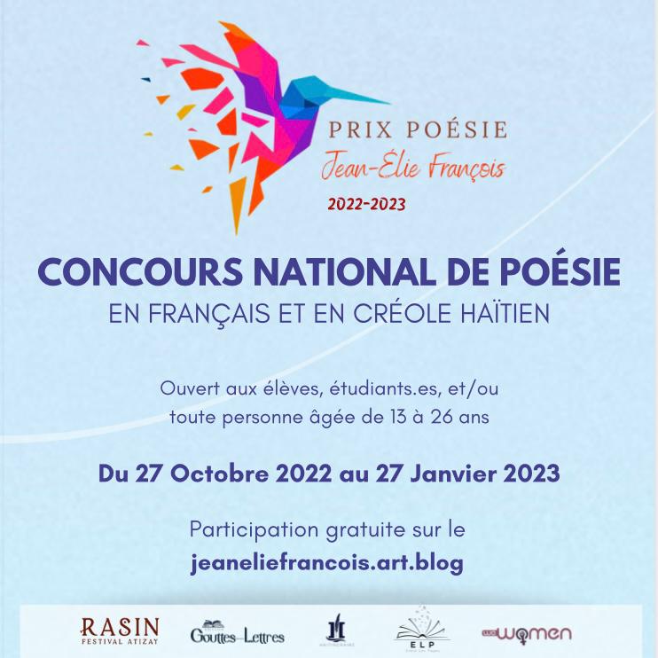 Ce concours qui s’étend sur tout le territoire national s’adresse aux jeunes de 13 à 26 ans ayant le goût des lettres. Les textes seront reçus jusqu’au 27 Janvier 2023, en français ou en créole haïtien, sur le site officiel du Prix: https://jeaneliefrancois.art.blog.